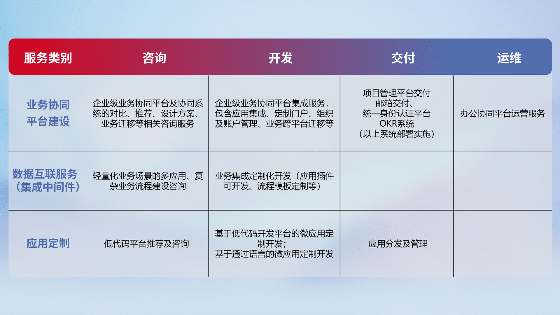 针对钉钉、、、企微、、IDaas等平台级产品提供产品的规划、、方案、、、、交付、、、、定制化开发等服务,,,,实现如统一协同办公、、、智能客户服务、、、、混合会议管理、、、、智能数据查询、、等业务场景,,,实现数字化转型。。。。